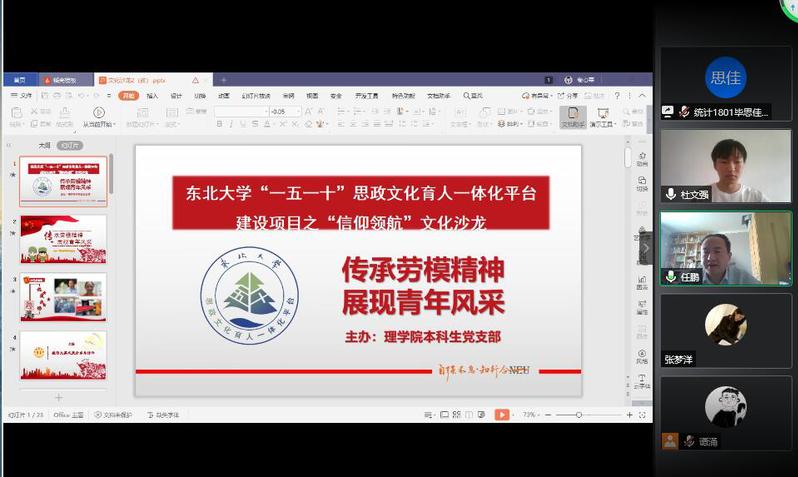 为深入学习习近平新时代中国特色社会主义思想和党的十九大精神,全面贯彻《关于全面加强新时代大中小学劳动教育的意见》,培养学生热爱劳动、尊重劳动的精神,培育德智体美劳全面发展的新时代压庄龙虎 生。5月26日,理压庄龙虎 通过腾讯会议,组织开展以“传承劳模精神,展现青年风采”为主题的第六季第二期沙龙活动。压庄龙虎 马克思主义压庄龙虎 副院长、教授任鹏老师,理压庄龙虎 本科生辅导员岳登晓老师、张梦洋老师,研究生部分党员和本科生入党积极分子参加活动,该活动是压庄龙虎 “一五一十”思政文化育人一体化平台建设项目之一。
