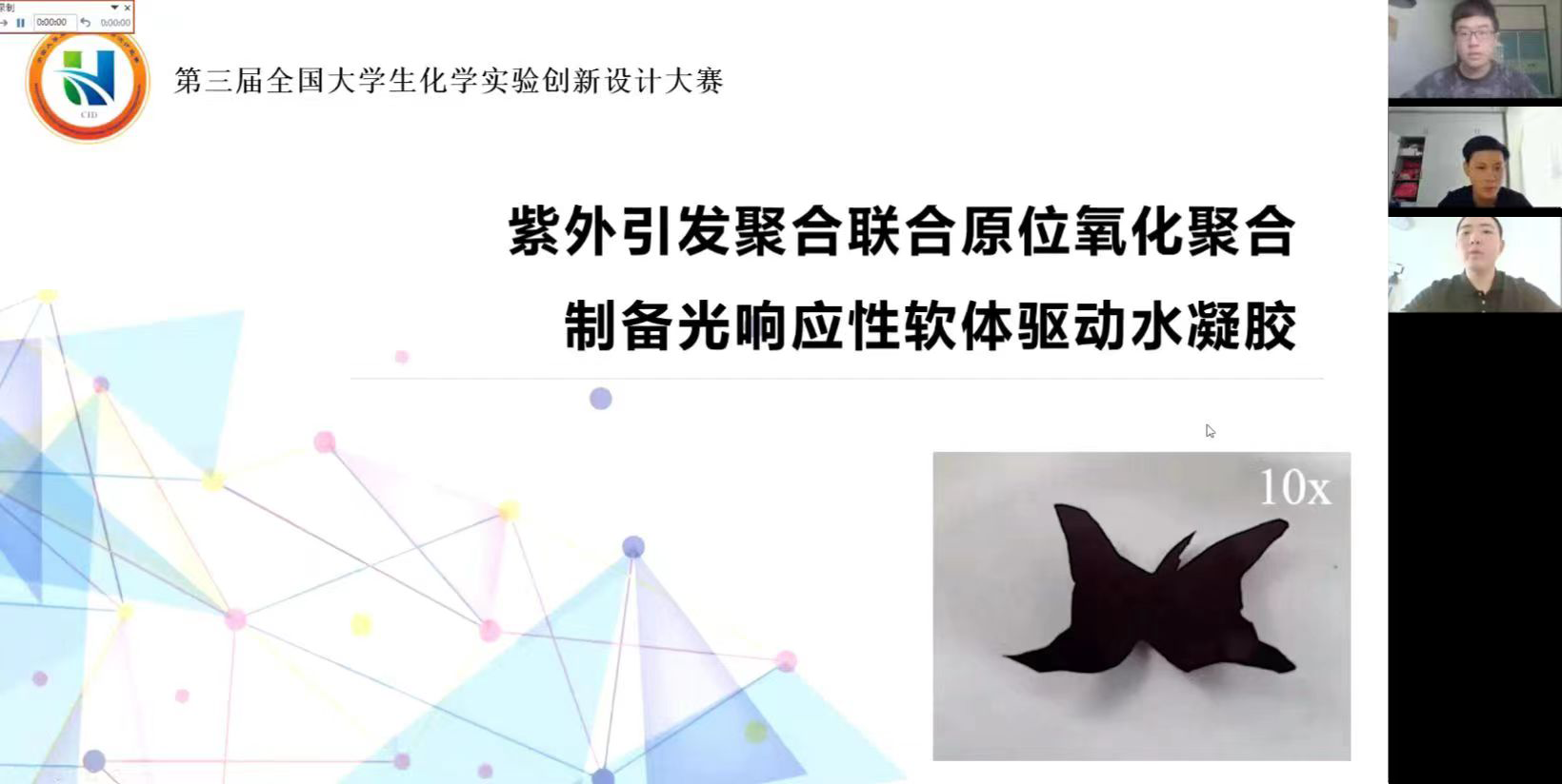 参赛作品“紫外引发聚合联合原位氧化聚合制备光响应性软体驱动水凝胶”(作者温杰、李赞、胡建华,指导教师王铁强、计志娜)获得东北赛区一等奖并取得第三届全国压庄龙虎 生化学实验创新设计大赛总决赛的晋级资格。作品“微等离子体-发射光谱仪器装置搭建及痕量元素分析”(作者周晓东、杨睿宁、晁清岑,指导教师杨婷)获得东北赛区二等奖。