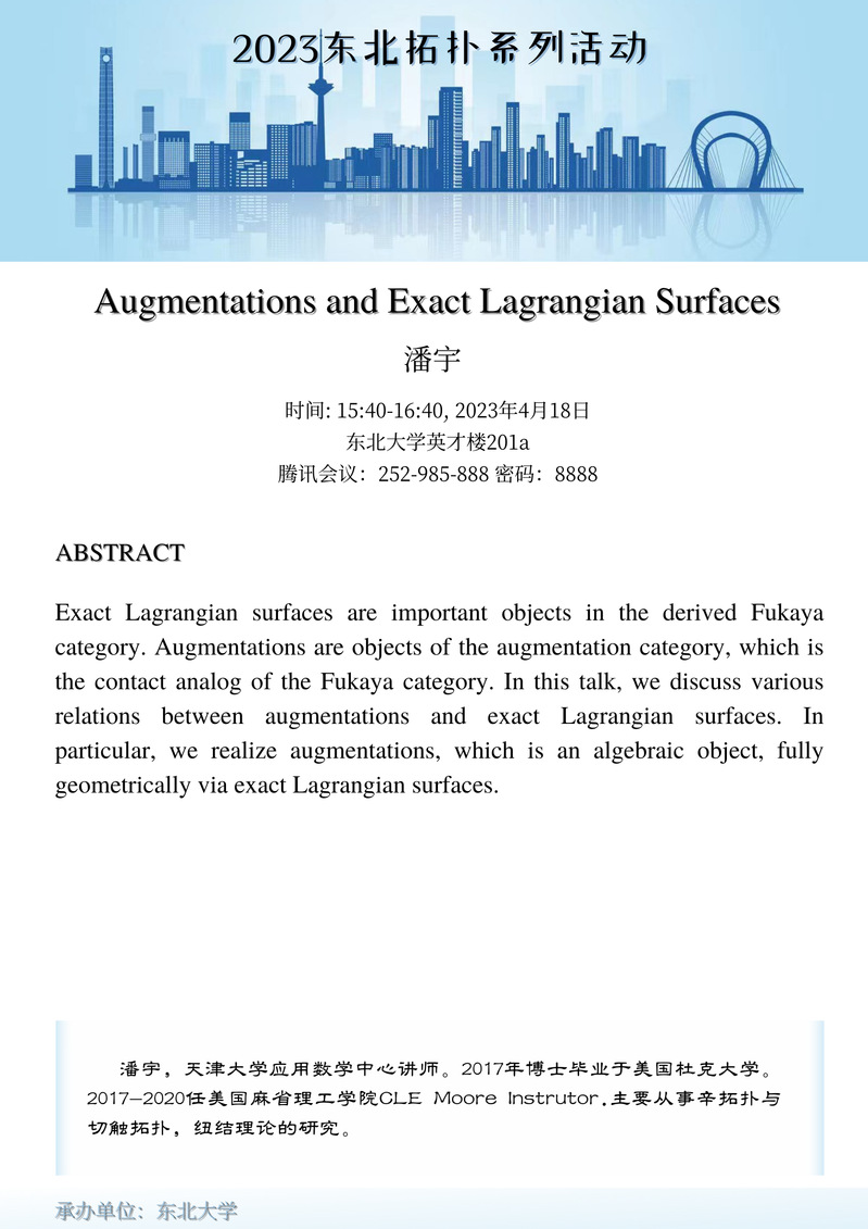 2023418日的报告人为清华压庄龙虎 丘成桐数学中心黄意和天津压庄龙虎 应用数学中心潘宇。