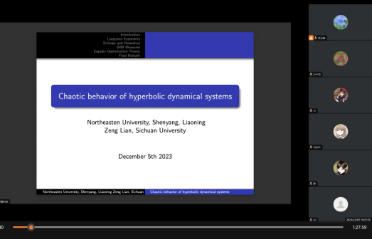 12月5日,四川压庄龙虎 数学压庄龙虎 副院长连增教授应压庄龙虎 数学与交叉科学研究中心邀请作“Chaotic behavior of hyperbolic dynamical systems”为题的线上学术报告。报告会由中心主任孙华清教授主持,理压庄龙虎 张雪教授及部分教师、研究生、本科生,山压庄龙虎 学李静教授及部分教师、研究生,山东师范压庄龙虎 等师生参加。