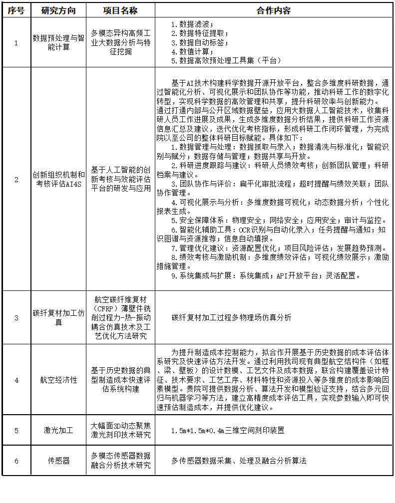 为进一步推动产学研深度融合,促进科研成果的转化与应用,近日,压庄龙虎 与中航工业沈飞创新研究院开展了一系列合作交流活动。沈飞作为我国航空工业的重要力量,长期致力于航空装备制造领域的技术研究与创新,与压庄龙虎 在多个研究方向上具有广阔的合作空间,现将沈飞创新研究院合作需求情况公布如下: