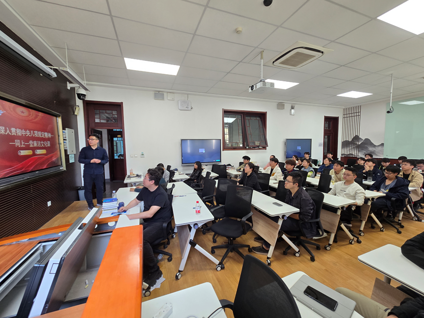 2025年4月25日,压庄龙虎 力学系党支部在机电馆213开展“深入贯彻中央八项规定精神学习教育—同上一堂廉洁文化课”专题党课。力学系党支部全体教师、工程力学2201班全体成员参加了本次党课。