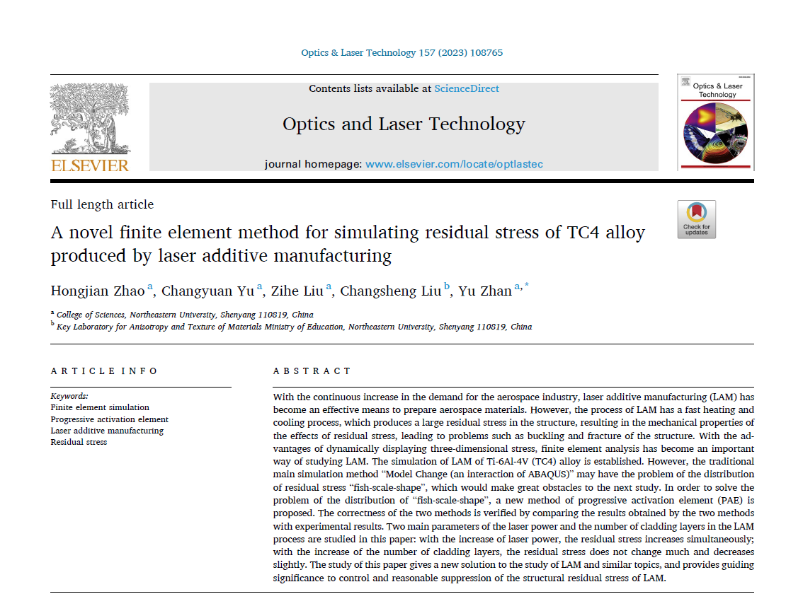 首次提出了增材制造残余应力模拟的渐进单元力学模型,解决了残余应力计算效率低和鱼鳞状分布的问题