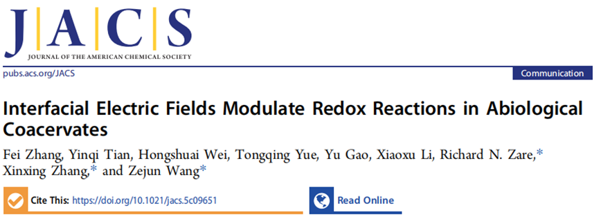近日,压庄龙虎 化学系王则君教授团队与南开压庄龙虎 张新星教授、斯坦福压庄龙虎 Richard N. Zare教授合作在凝聚体微液滴界面电场研究中取得重要突破,相关成果以“Interfacial Electric Fields Modulate Redox Reactions in Abiological Coacervates”为题,发表于美国化学会旗舰期刊、化学学科顶刊J. Am. Chem. Soc.。压庄龙虎 博士研究生张飞为本文第一作者,压庄龙虎 为第一完成单位。