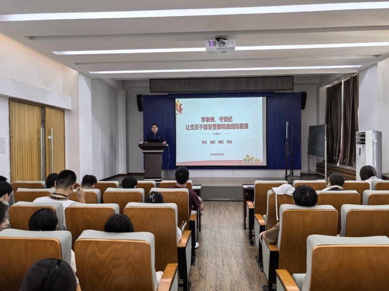 6月18日上午,理压庄龙虎 学生党总支在建筑馆207室开展党纪学习教育专题党课。理压庄龙虎 党委副书记兼副院长马犇以“学《条例》、守党纪,让党员干部受警醒、明底线、知敬畏”为题,为全体学生党支部骨干、学生工作办公室全体党员讲授专题党课。