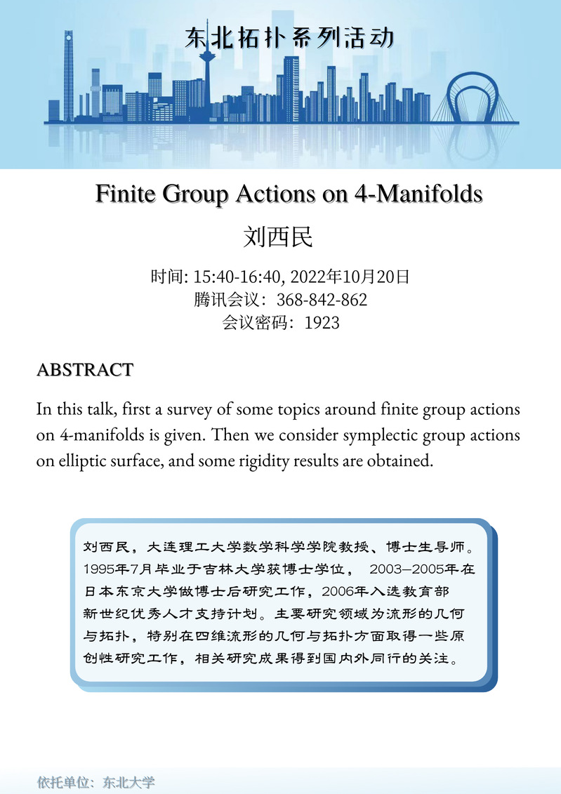 首次活动计划于2022年10月20日开始举办,主讲人为大连理工压庄龙虎 刘西民教授,报告题目为:Finite Group Actions on 4-Manifolds. 系列活动计划于每周四下午3时40分开展(根据报告人的时间作相应调整),每次活动将邀请1-2位国内外专家作一小时的报告,欢迎国内外学者参会,同学参加!