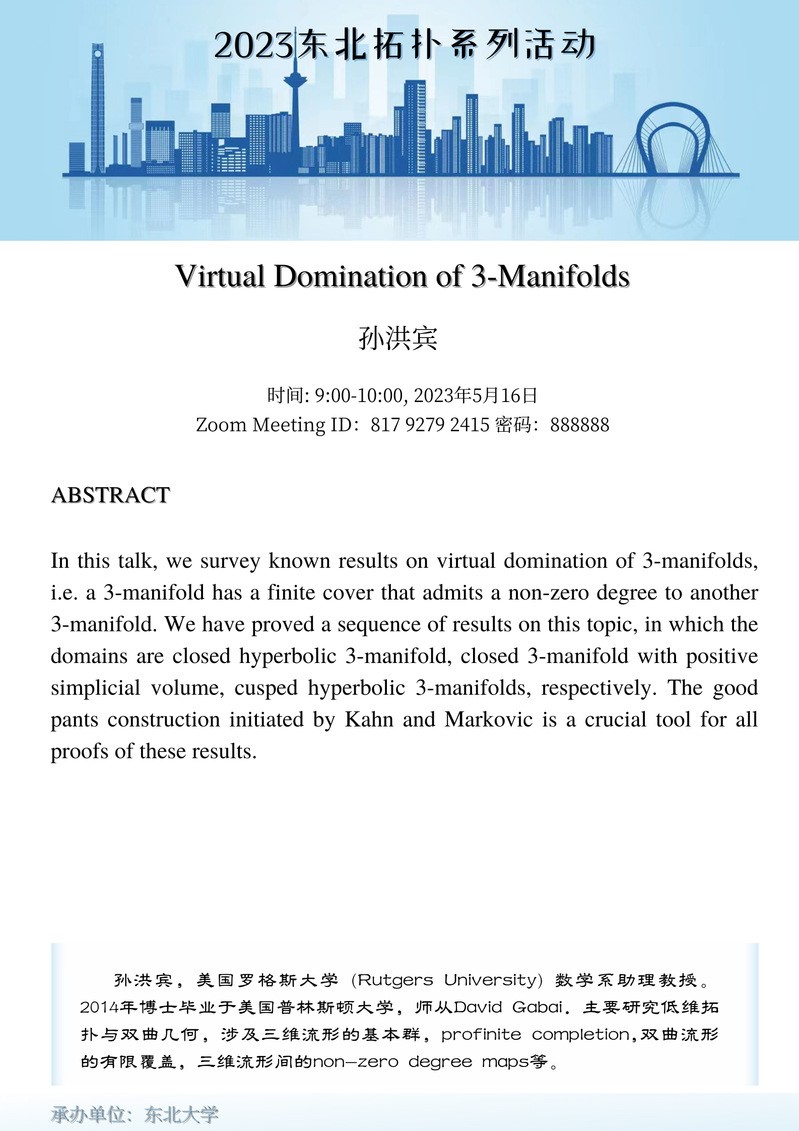 2023年5月16日的报告人为美国罗格斯压庄龙虎 (Rutgers University)孙洪宾。