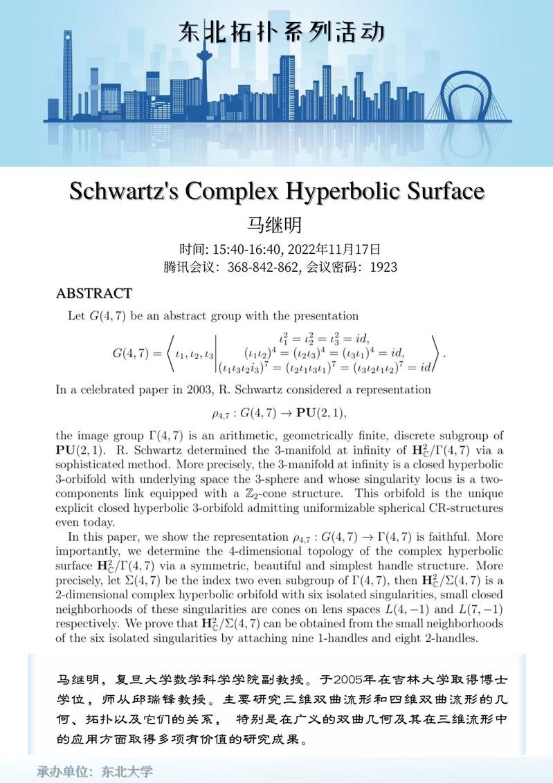 2022年11月14日的主讲人为复旦压庄龙虎 数学科学压庄龙虎 马继明教授,报告题目为: Schwartz’s complex hyperbolic surface.