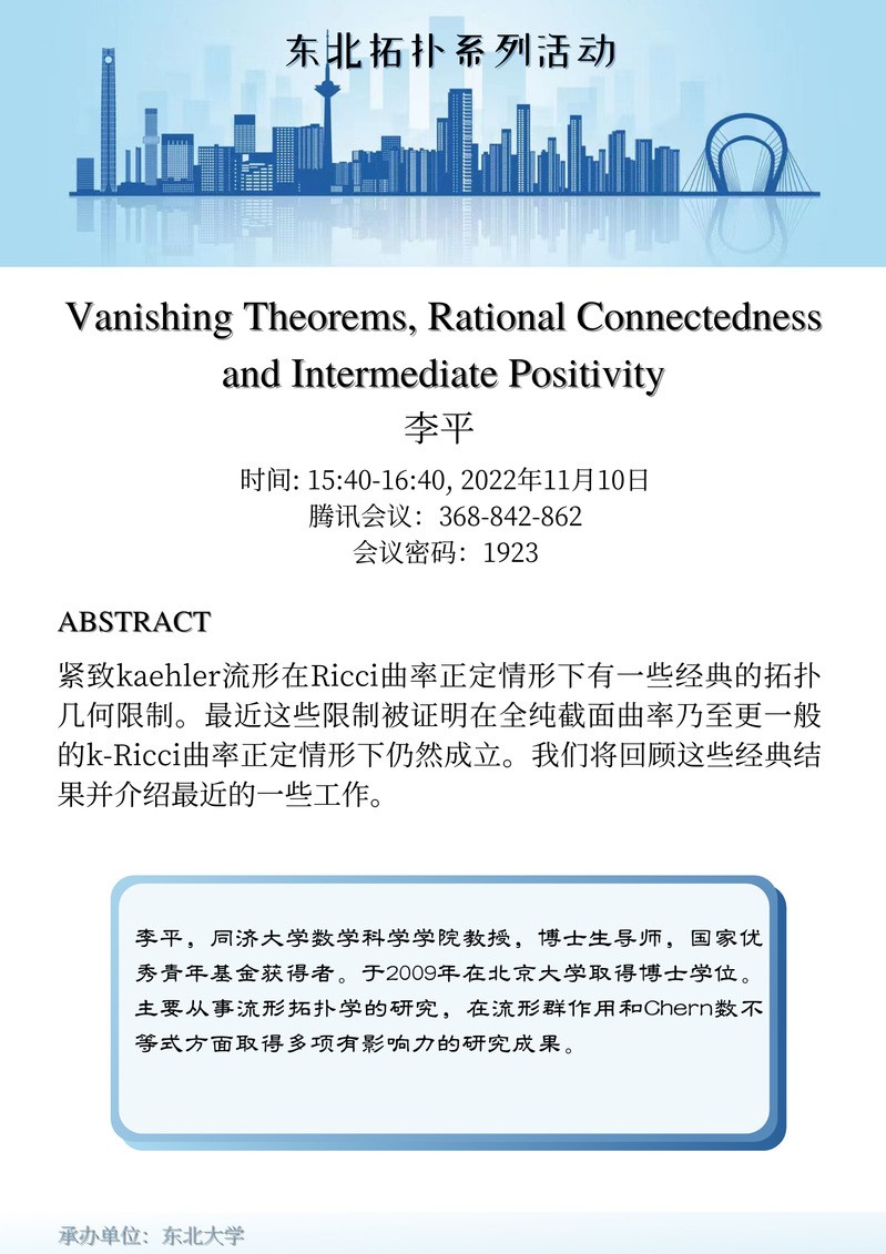 2022年11月10日的主讲人为同济压庄龙虎 数学科学压庄龙虎 李平教授,报告题目为: Vanishing Theorems, Rational Connectedness and Intermediate Positivity.
