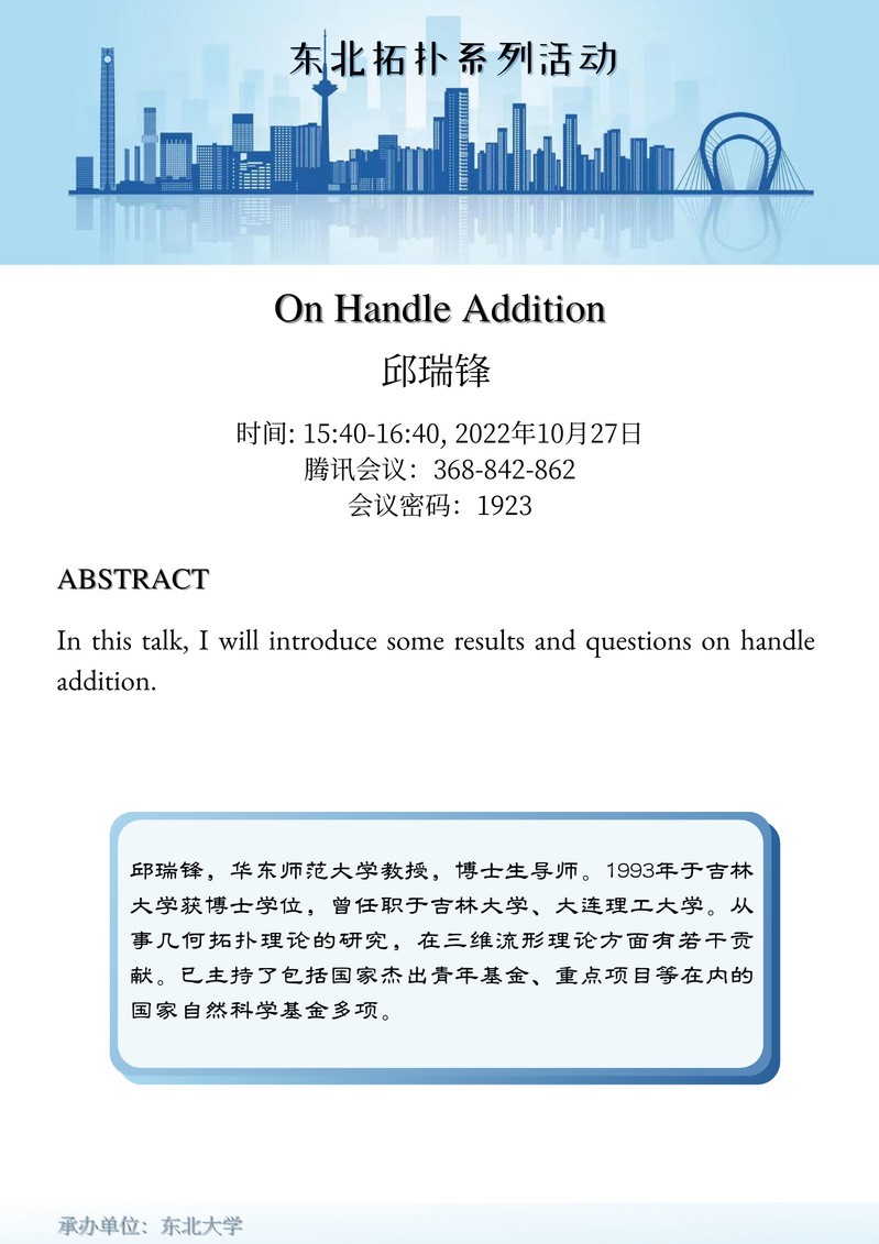 2022年10月27日的主讲人为华东师范压庄龙虎 邱瑞锋教授,报告题目为: On Handle Addition.