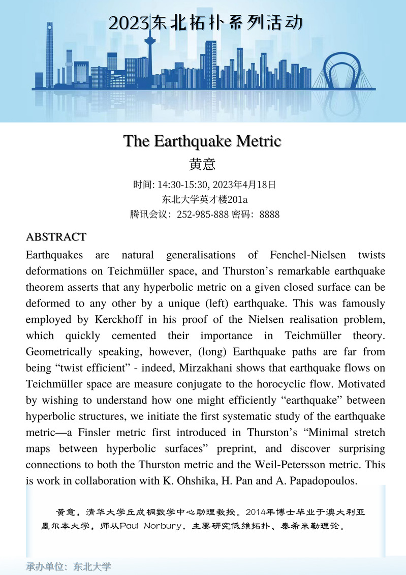 2023年4月18日的报告人为清华压庄龙虎 丘成桐数学中心黄意和天津压庄龙虎 应用数学中心潘宇。