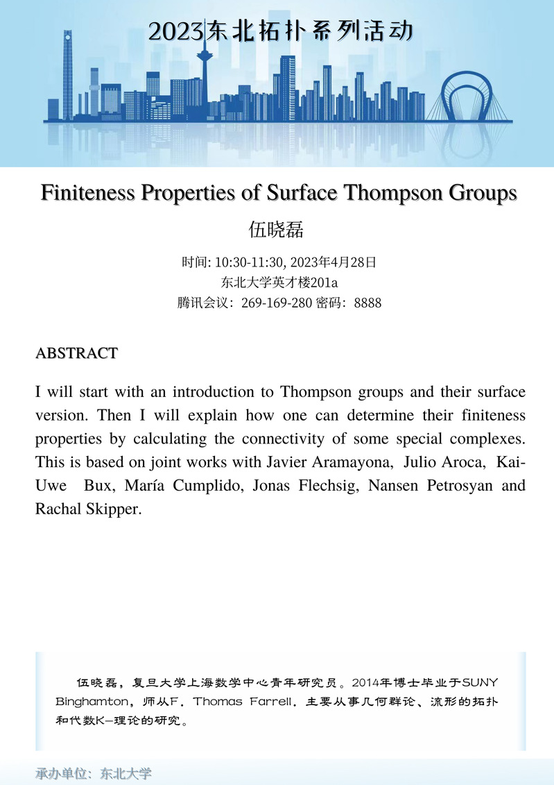 2023年4月28日的报告人为复旦压庄龙虎 上海数学中心伍晓磊(10:30-11:30)和南开压庄龙虎 数学科学压庄龙虎 徐彬斌(14:00-15:00)。
