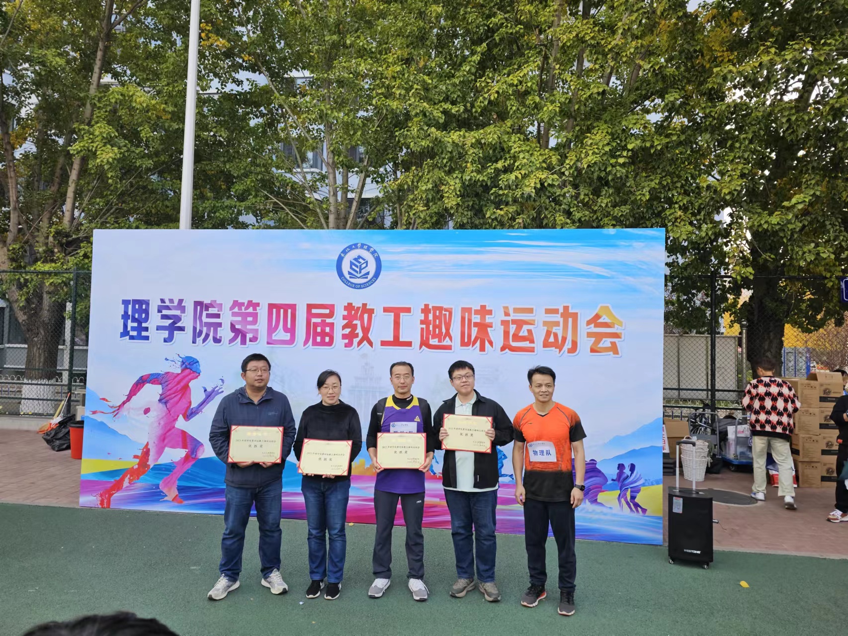 图为参加师生歌会部分教师合影及趣味运动会领奖照片